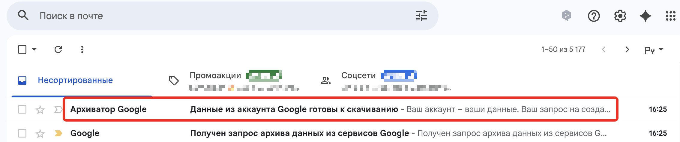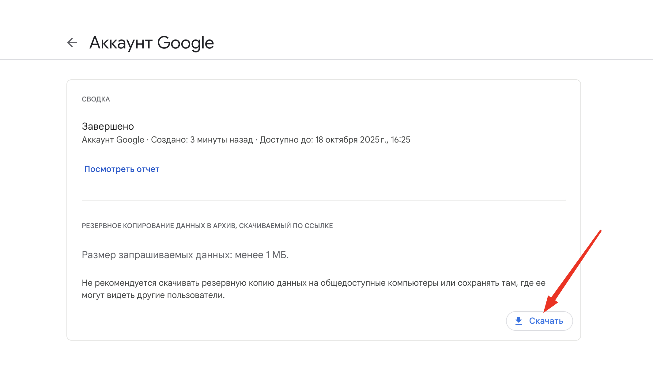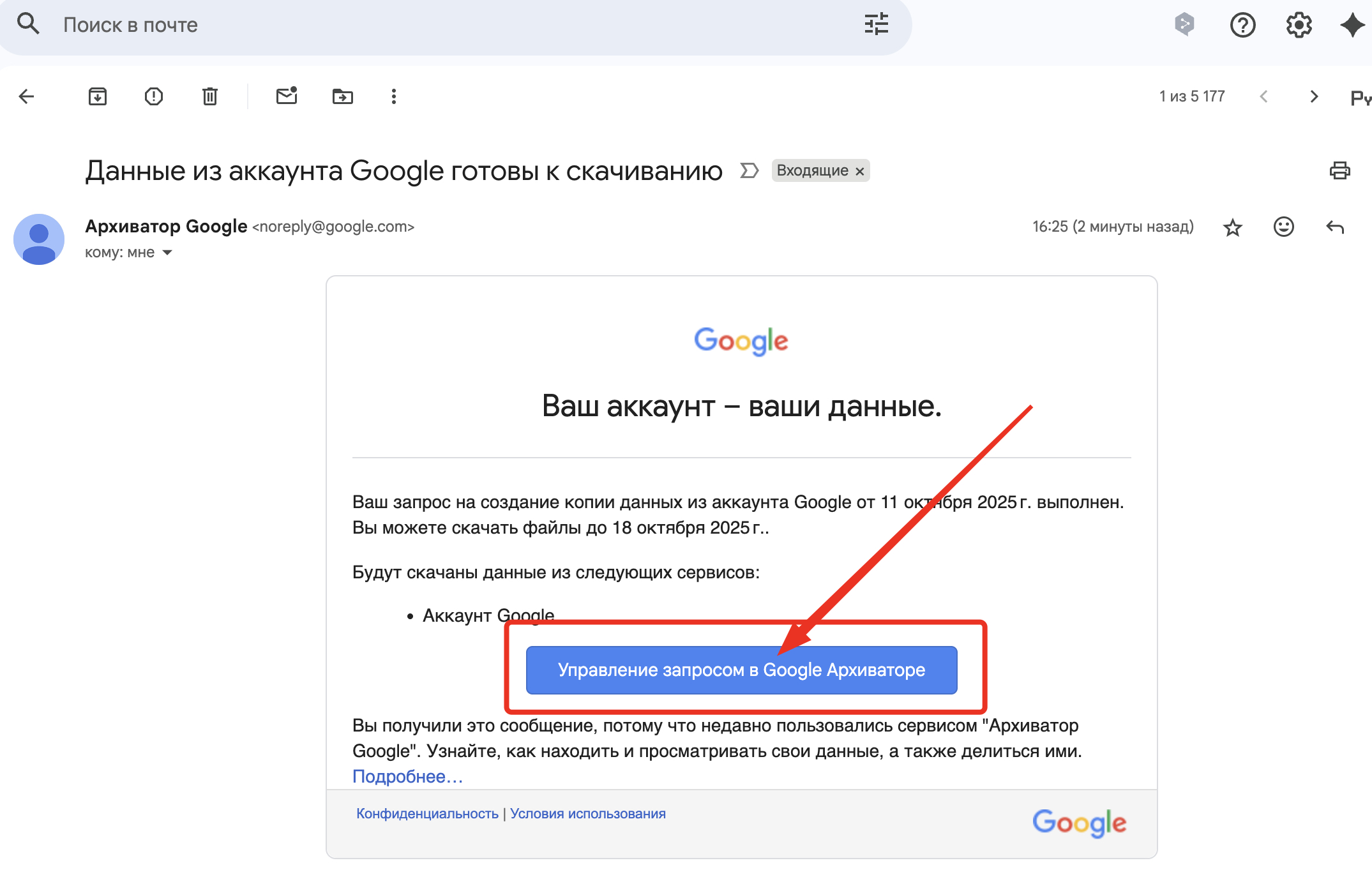 Шаг 4. После чего Вам придет письмо на почту, для скачивания архива с данными об аккаунте Google.