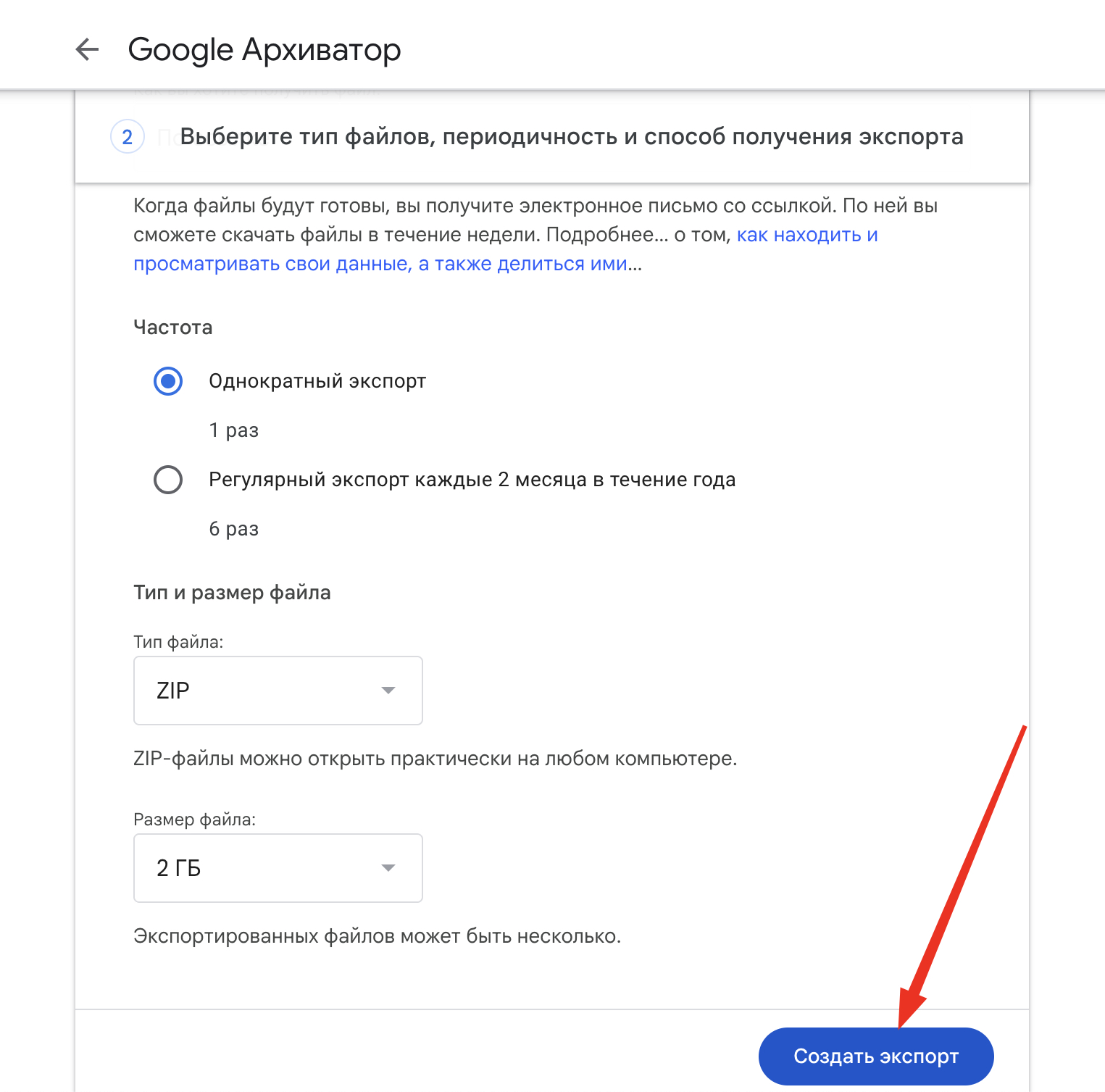 Шаг 3. На следующей странице ничего не меняем, жмем "Создать экспорт"