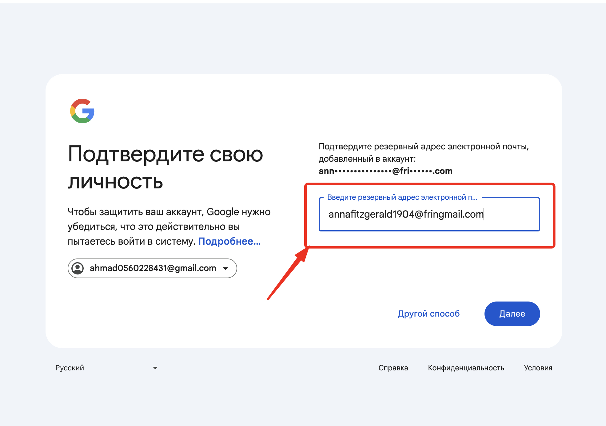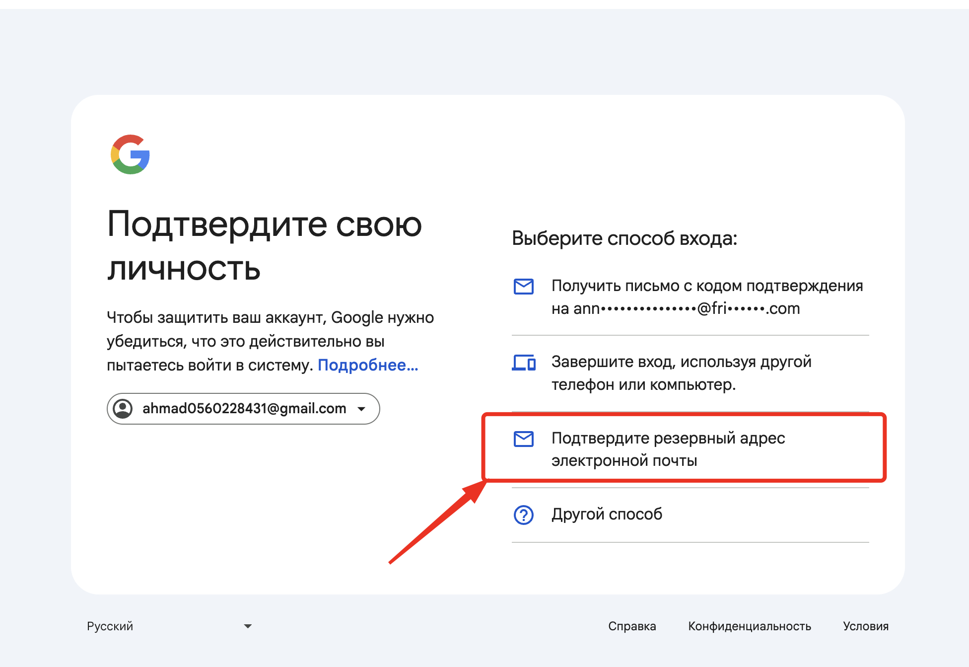 Шаг 2. На этапе где просит "подтвердить свою личность" и выбрать способ входа, выбираем "Подтвердите резервный адрес электронной почты (Confirm your recovery email)" и после того как выбрали этот вариант, просто вводим в поле резервный адрес от вашего аккаунта гугл и жмем "Далее"