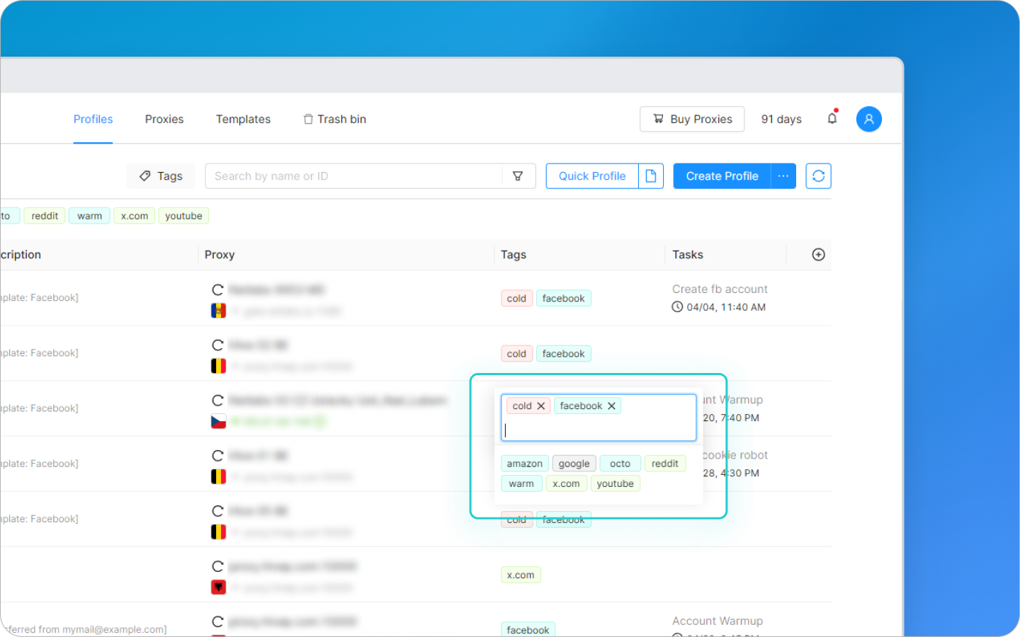 Каждому профилю можно назначить теги. Это удобный способ обозначить его статус или назначение. Например, фармер создает и прогревает аккаунт — ставит тег «фарм». Аккаунт готов — тег меняется на «медиабаинг», и профиль передаётся байеру. Такая простая маркировка помогает избежать путаницы и не запустить рекламу с неподготовленного аккаунта.