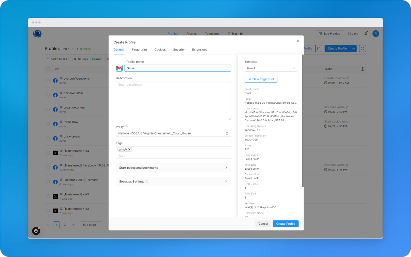 А если нужно сразу много профилей — поможет функция массового создания. Она позволяет сгенерировать десятки уникальных конфигураций за пару кликов, используя заранее подготовленные шаблоны или данные из таблиц. Быстро, удобно и безопасно.